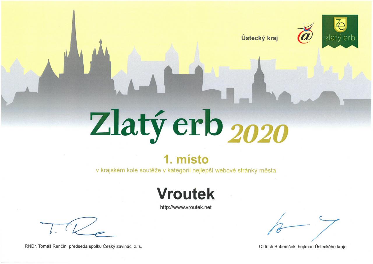 Město Vroutek se zúčastnilo se svými webovými stránkami soutěže Zlatý erb 2020, kde se vyhodnocují výstupy, aktivita atd. Město Vroutek se umístilo na 1. místě.