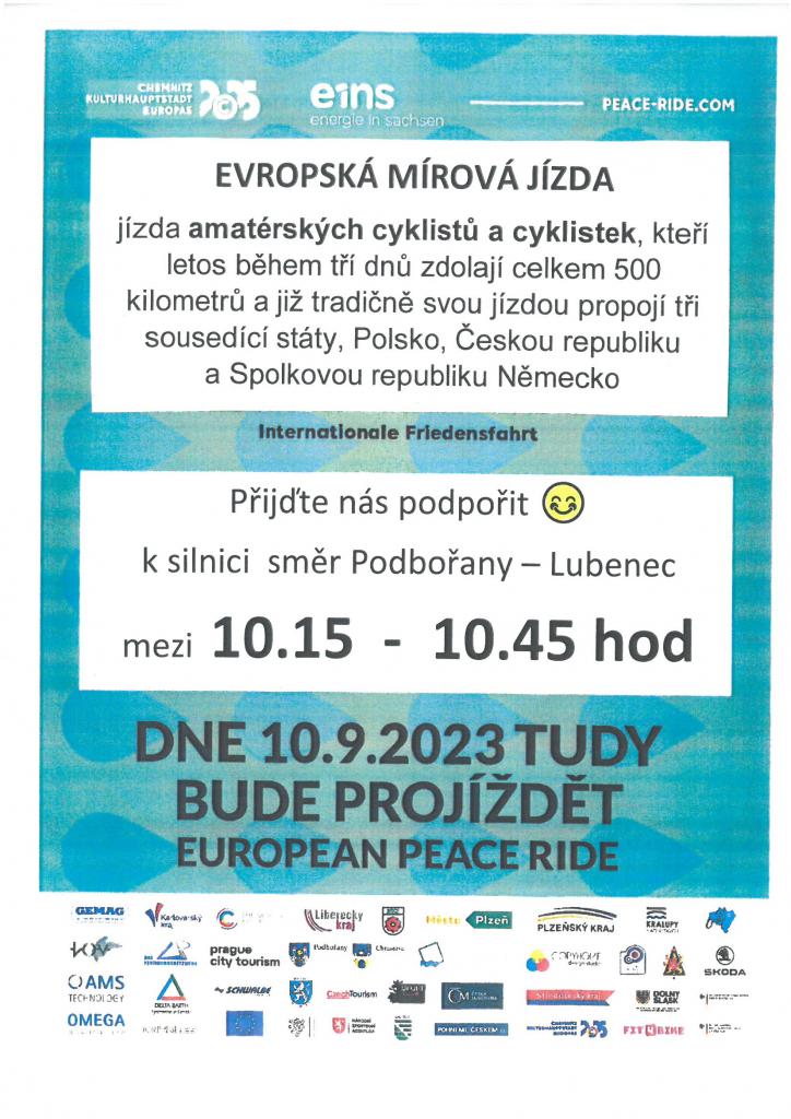 V neděli 10. září přibližně mezi 10.15 a 10.45 hod. bude přes Lužec a přes Vroutek projíždět cyklistický závod European Peace Ride. Přijďte podpořit cyklisty.