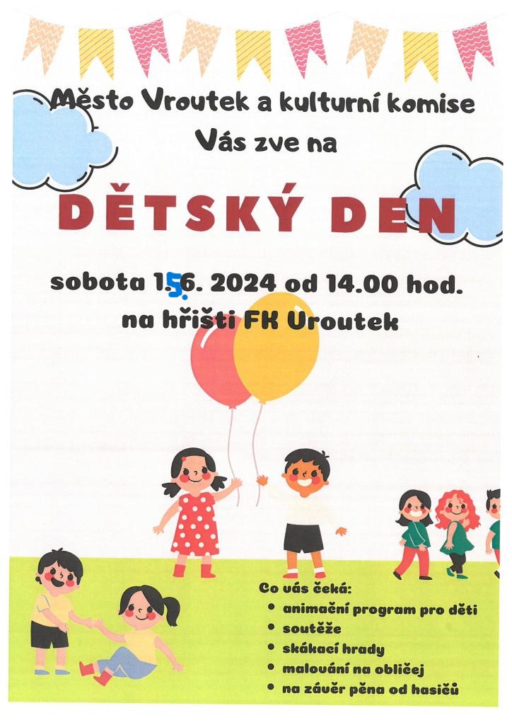 Kulturní komise města Vroutek pořádá dne 15. června Dětský den na malém hřišti v areálu Fotbalového klubu od 14:00 hodin.