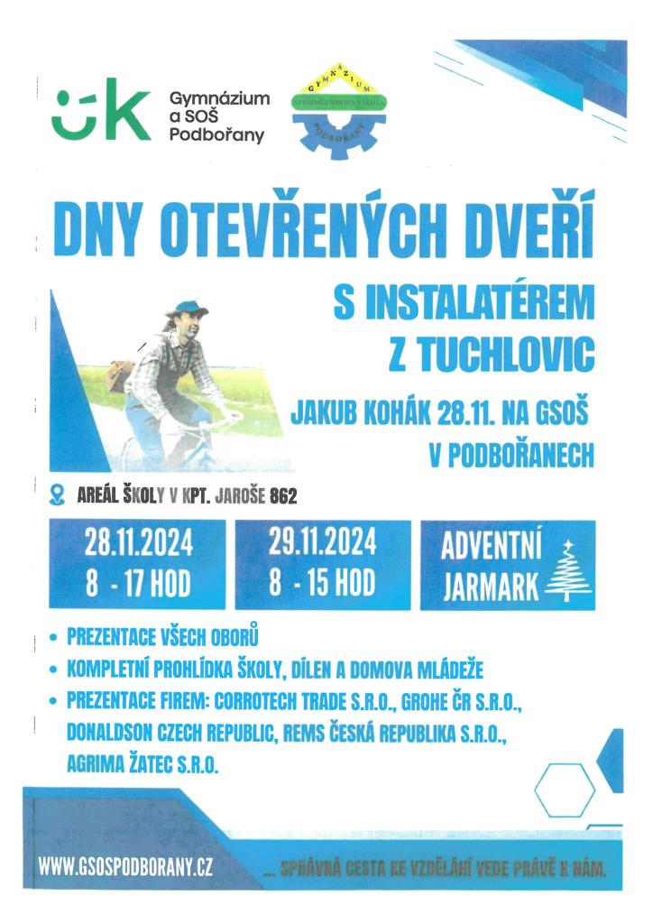 DNY OTEVŘENÝCH DVEŘÍ S INSTALATÉREM Z TUCHLOVIC. Dne 28.11.2024 od 8:00 - 17:00 hod s Jakubem Kohákem. Dne 29.11.2024 od 8:00 - 15:00 hod. AREÁL ŠKOLY V KPT. JAROŠE 862, PODBOŘANY