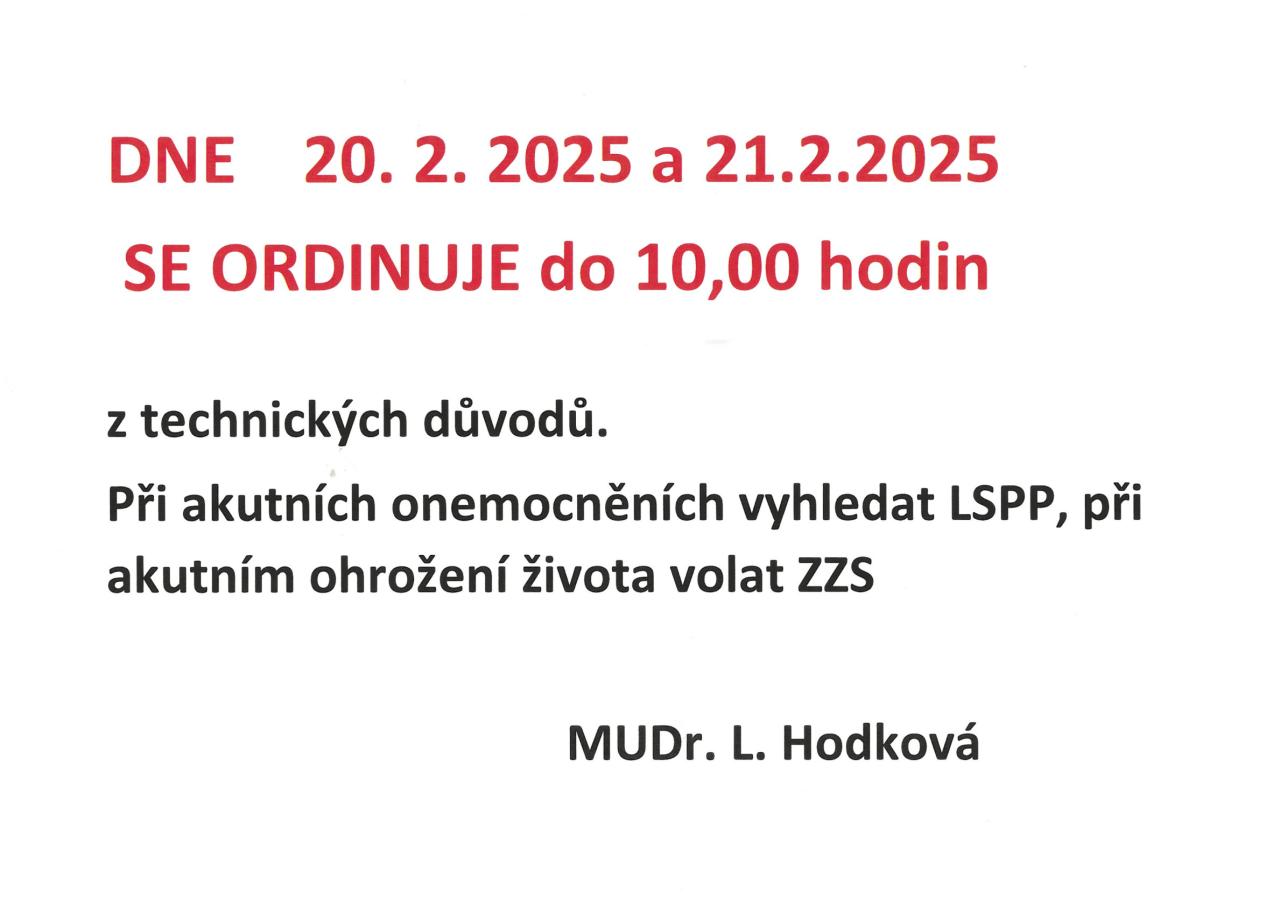 Dne 20.2.2025 a 21.2.2025 se ordinuje do 10:00 hod, z technických důvodů.