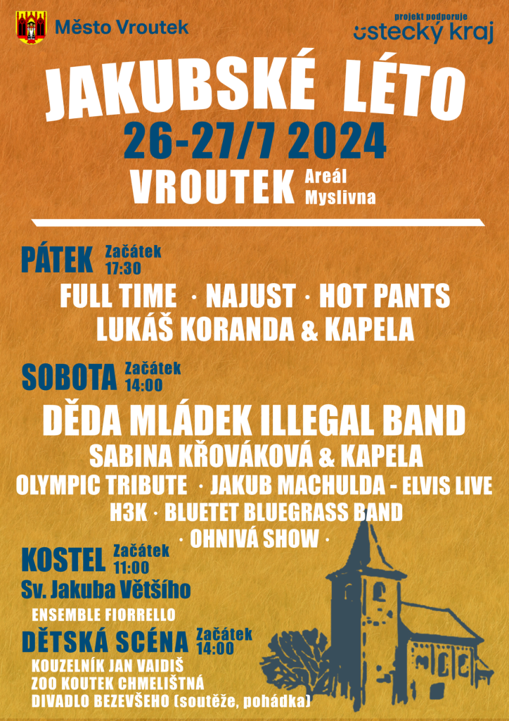Ve dnech 26. 7. a 27. 7. Vás zveme na Jakubské léto 2024 ve Vroutku. Projekt podporuje Ústecký kraj. www.kr-ustecky.cz