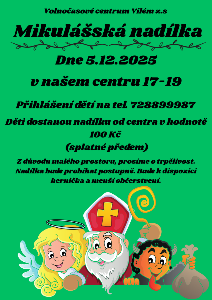 Dne 5. 12. 2025 v centru Vilém (bývalé zdravotní středisko) od 17-19 hod. Přihlášení dětí na tel. 728 899 987. Děti dostanou nadílku od centra v hodnotě 100 Kč, splatné předem. Volnočasové Centrum Vilém z.s.