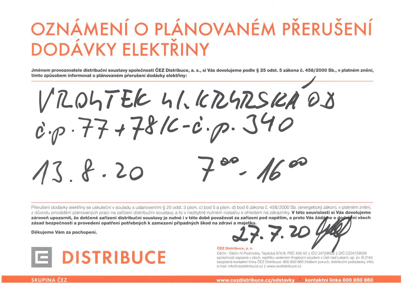 Oznámení o přerušení dodávky elektřiny ul. Kryrská, Vroutek
