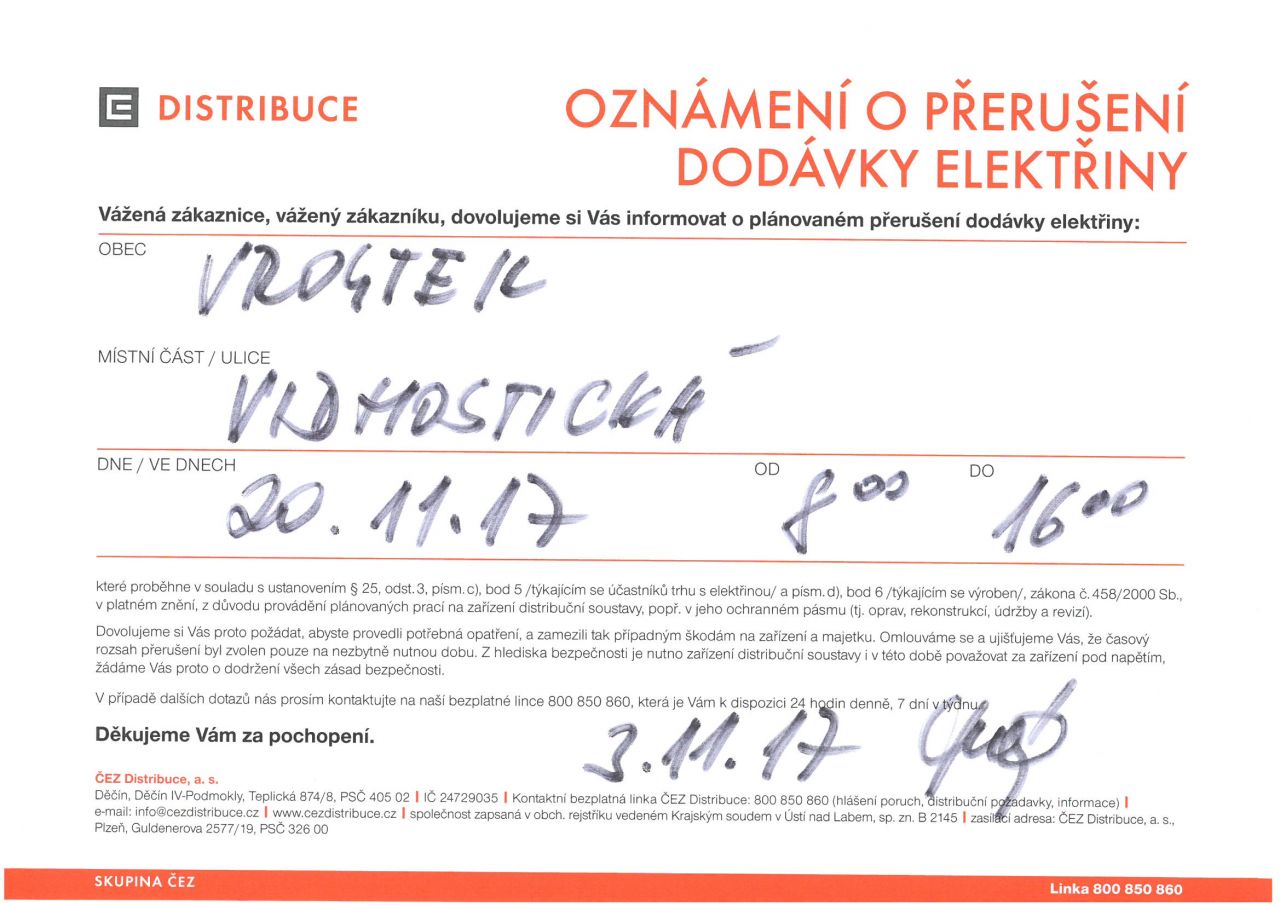 Oznámení o přerušení dodávky elektřiny ul. Vidhostická, Vroutek