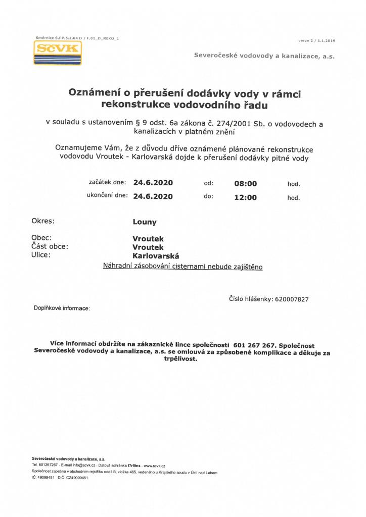 Oznámení o přerušení dodávky vody