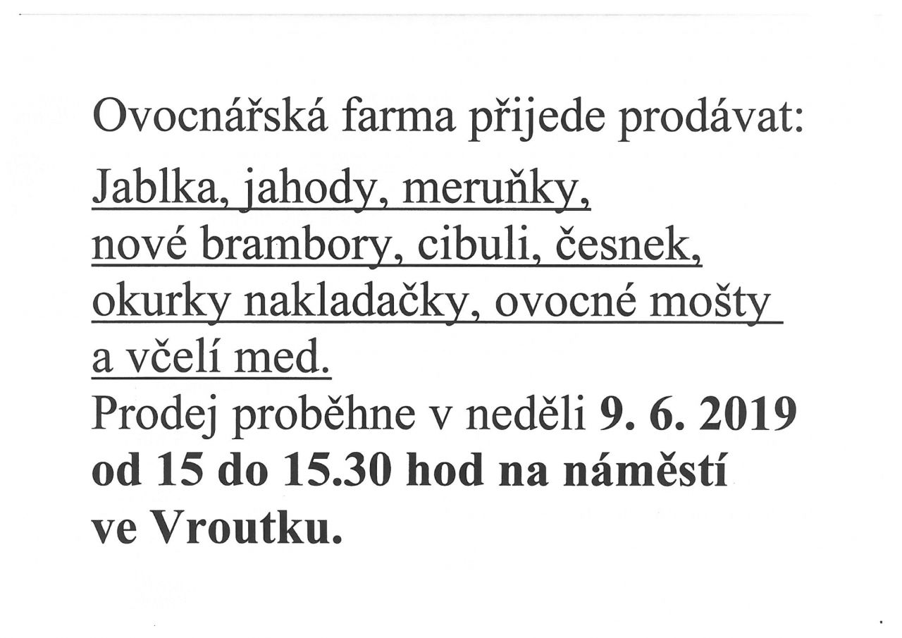 Prodej ovoce dne 9.6.2019 od 15 - 15,30 hod. nám. Míru ve Vroutku