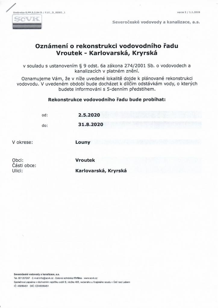 Severočeská vodárenská společnost (SVS) zahajuje plánovanou investiční akci roku 2020: Ve Vroutku, v ulicích Kryrská a Karlovarská, provedeme rekonstrukci dožilého a poruchového vodovodu, pro cca 100 napojených obyvatel. Stavbu koordinujeme s městem Vroutek, které plánuje provést v budoucnu obnovu povrchů.