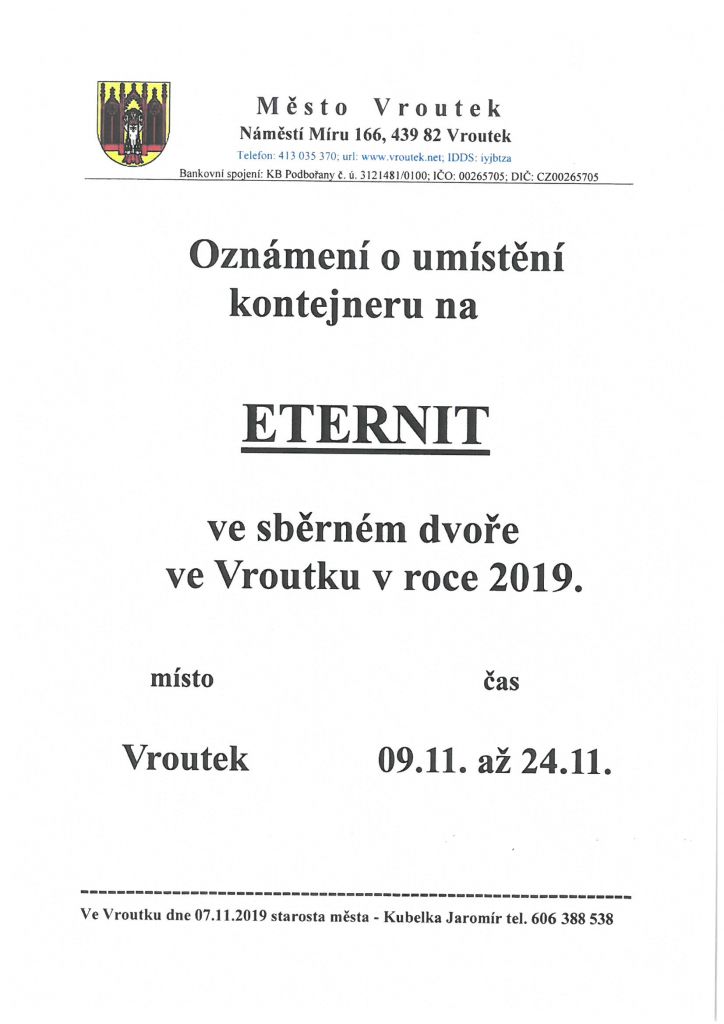 Umístění kontejneru na eternit ve Sběrném dvoře ve Vroutku.