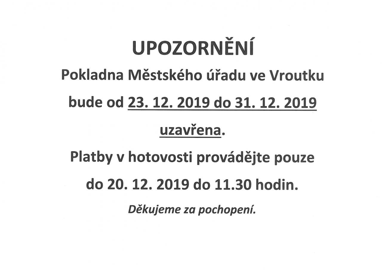 Pokladna Městského úřadu ve Vroutku bude od 23.12. - 31.12.2019 uzavžena.