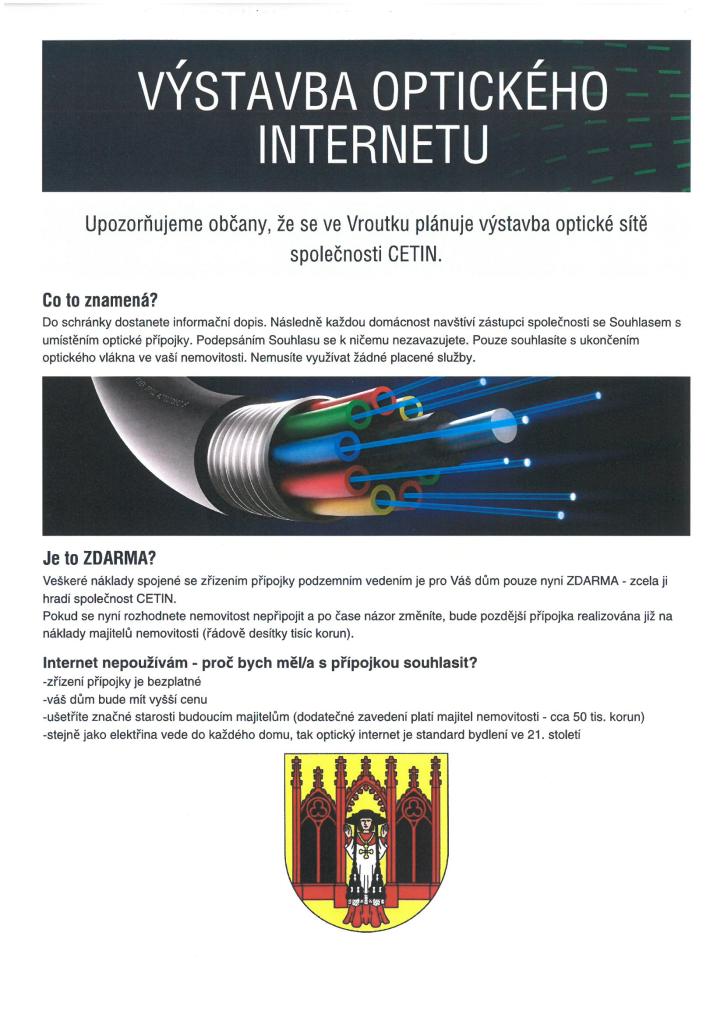 Upozorňujeme občany, že se ve Vroutku plánuje výstavba optické sítě společnosti CETIN.