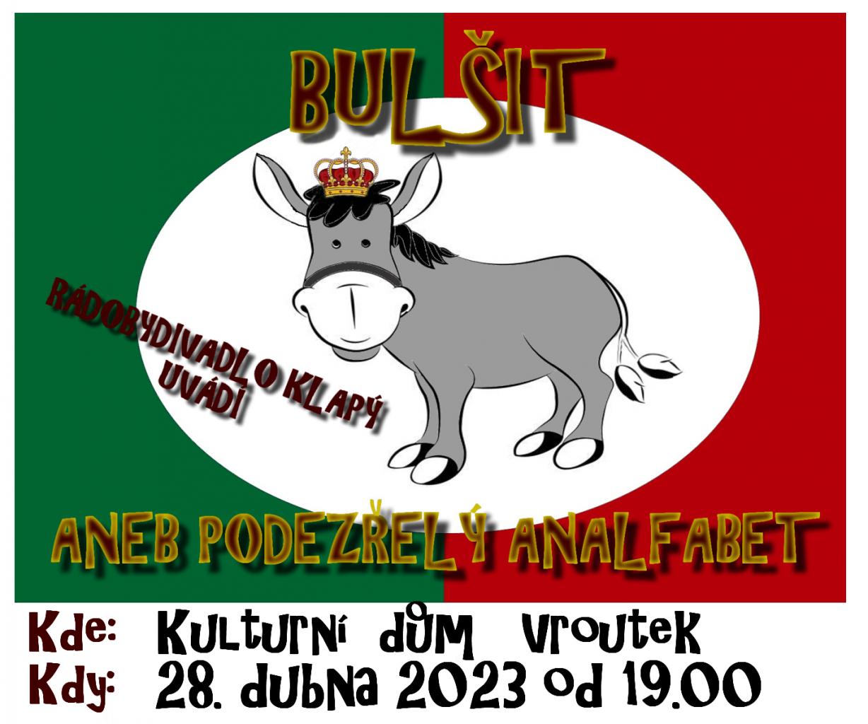 Rádoby divadlo Klapý uvádí 28. dubna od 19:00 v Kulturním domě ve Vroutku divadelní představení BULŠIT ANEB PODEZŘELÝ ANALFABET.